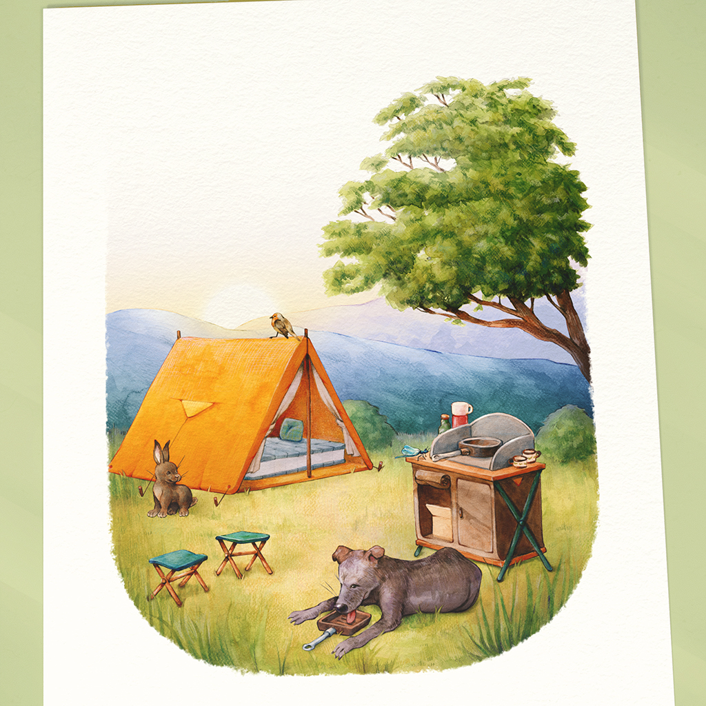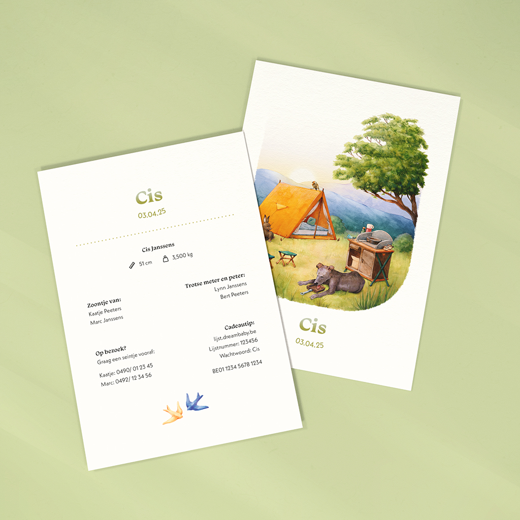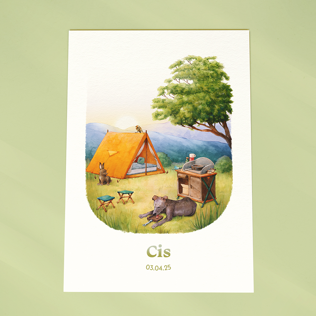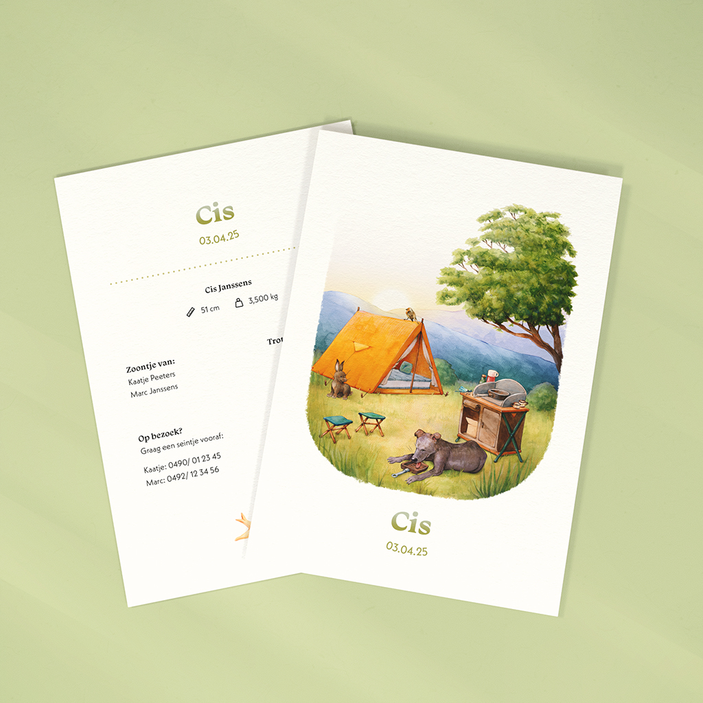 Dit unieke geboortekaartje is op maat ontworpen voor de ouders van Cis, die houden van kamperen. Ze wilden een mooie herinnering vastleggen in een handgeschilderde illustratie.